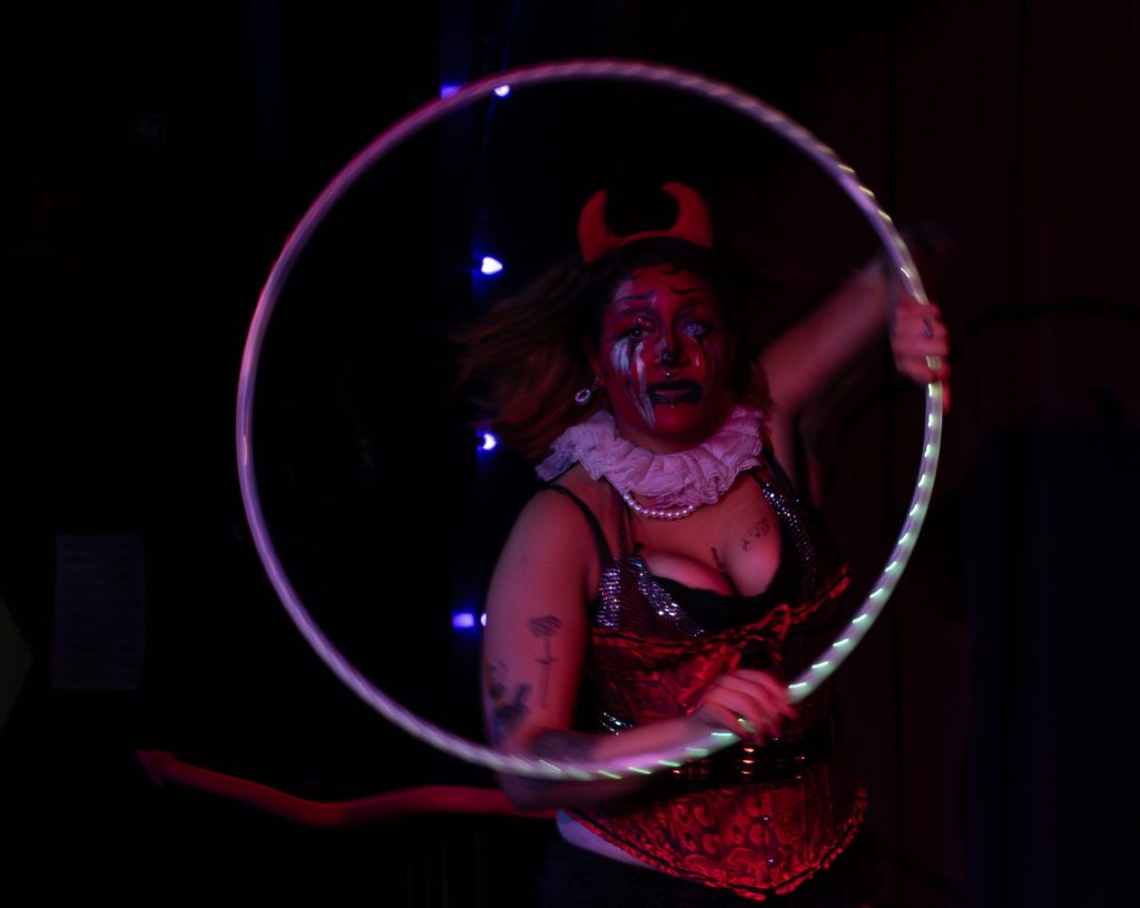 I’m a clown by trade. I started off doing circus arts, flow arts like hula hooping, and then I went to fire eating, fire breathing, and stuff like that. I didn’t really have a character. I was just me performing, but then a homie asked me to join one of their shows. I decided that my character was going to be a clown because I’m naturally just a clowny ass bitch. I won class clown in my yearbook. It just felt right. I feel like myself in clown makeup. I really wanted to make a character that was pretty much just an exaggerated extension of me. I was like, “I need to do something.” I need to perform in a way where I can pour my heart out, where I can be myself instead of looking hot and being eye candy for straight people.